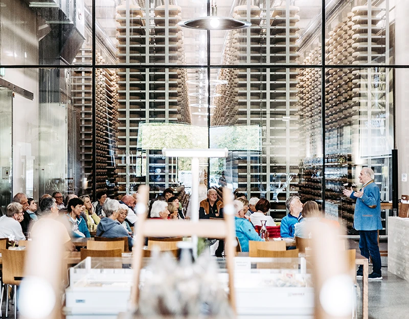 Erleben Sie hautnah durch eine Glaswand den Bregenzerwälder Käsekeller – das größte Reife- und Pflegezentrum für Berg- und Alpkäse in Europa. Hier können Sie sehen, wie